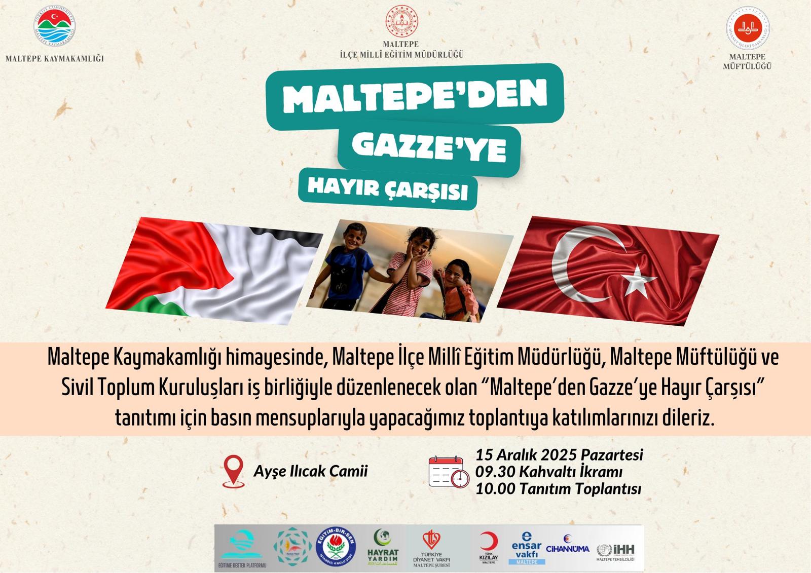 Maltepe Kaymakamlığı, İlçe Milli Eğitim Müdürlüğü ve Maltepe Müftülüğü öncülüğünde, Gazze’deki insani krize dikkat çekmek ve yardım sağlamak amacıyla “Maltepe’den Gazze’ye Hayır Çarşısı” düzenleniyor. Etkinlik, 19-20-21 Aralık tarihlerinde Maltepe Cumhuriyet Meydanı’nda 10.30 ile 17.30 saatleri arasında gerçekleştirilecek.